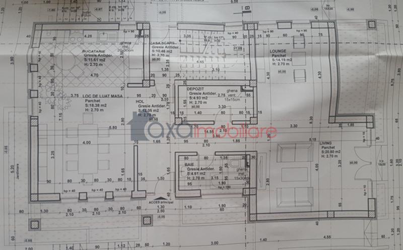 PARTER / PRIMUL NIVEL: living, bucatarie, loc de luat masa, lounge, depozit, casa scarii, hol, baie, terasa.