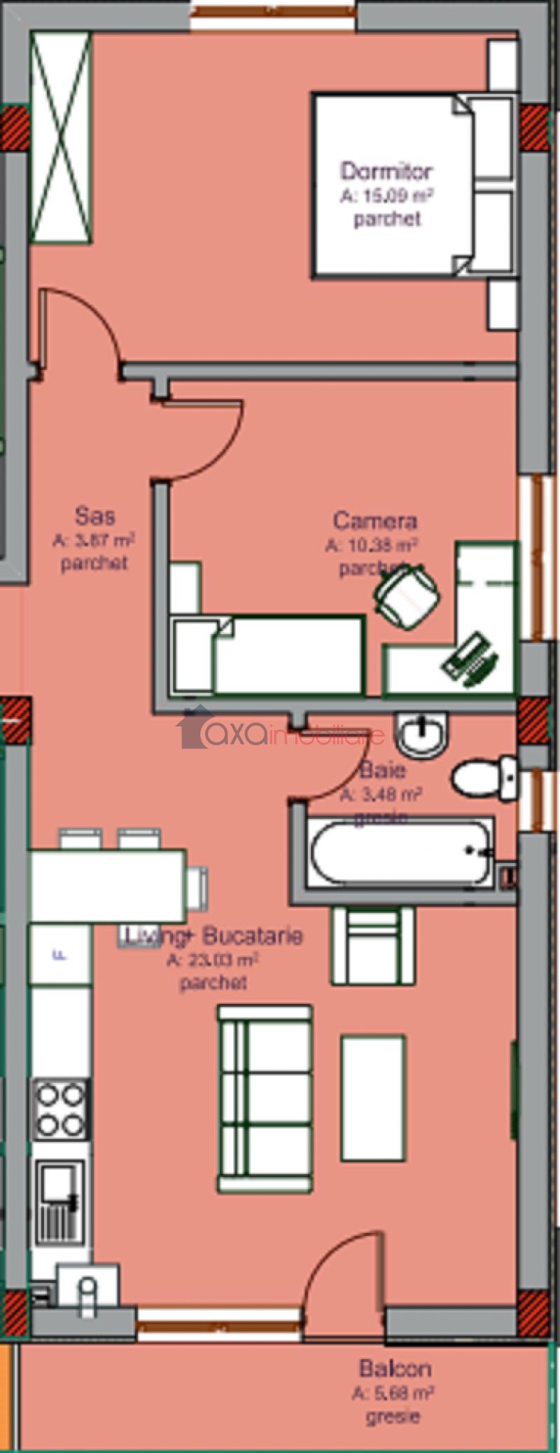 Compartimentarea este semidecomandata si gandita astfel: 1 living cu 1 bucatarie de tip open space, 2 dormitoare, 1 baie, 1 hol si 1 balcon.
