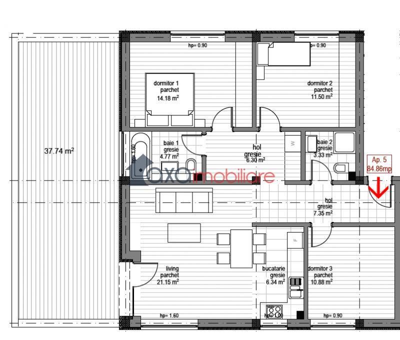 De vanzare apartament cu 4 camere, suprafata utila 85 mp, imobil nou, pozitionat la etaj intermediar (1E/D+P+2E+M), ce dispune de terasa cu suprafata de 37 mp.