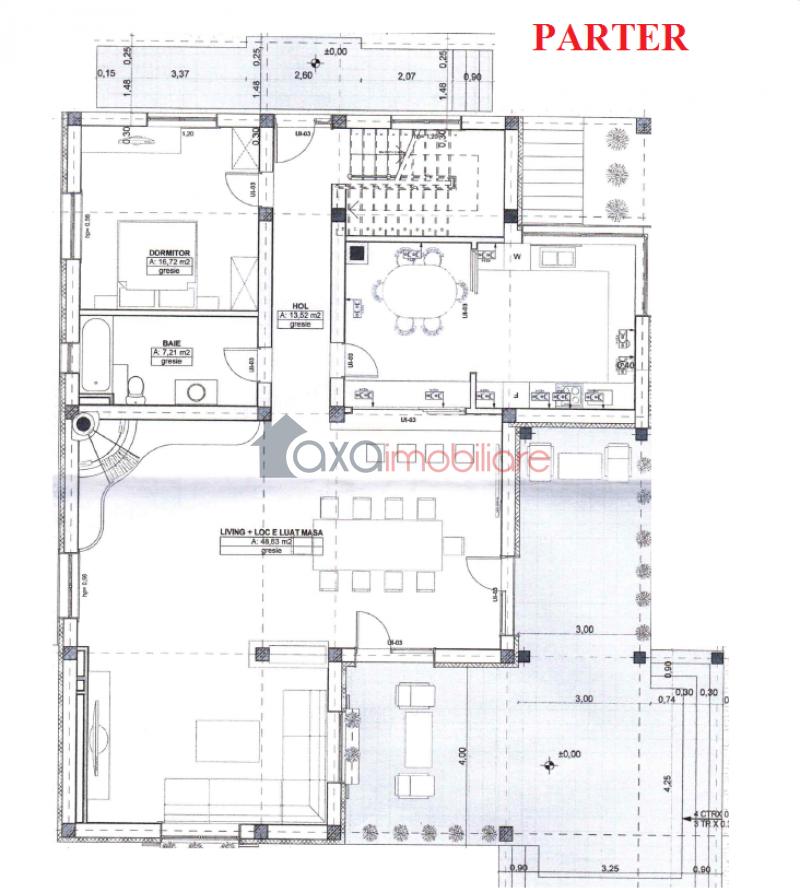 PARTER: 1 living cu loc de luat masa, 1 bucatarie, 1 hol, 1 dormitor, 1 baie, casa scarii, 1 terasa de 60 mp.