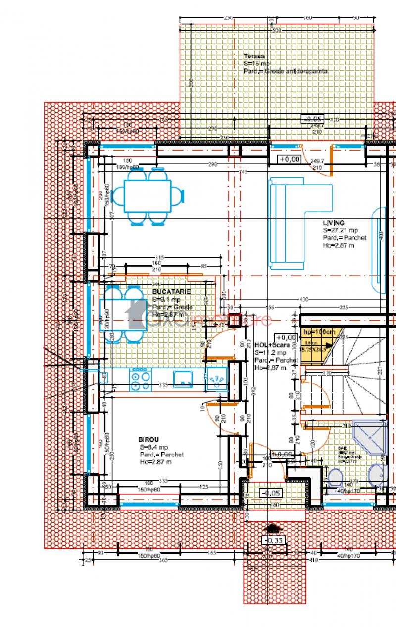 La primul nivel - PARTER se afla zona de zi; compusa dintr-un living cu dining, 1 bucatarie, 1 birou, 1 hol, 1 baie, casa scarii + 1 terasa.
