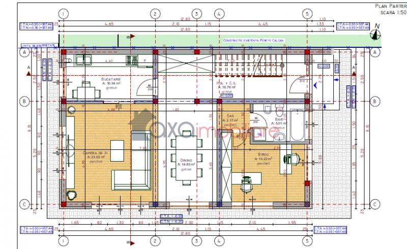 PARTER / PRIMUL NIVEL: Hol, dining, 1 birou, 1 sas, 1 living, 1 bucatarie, 1 baie, scara interioara (acces etaje).