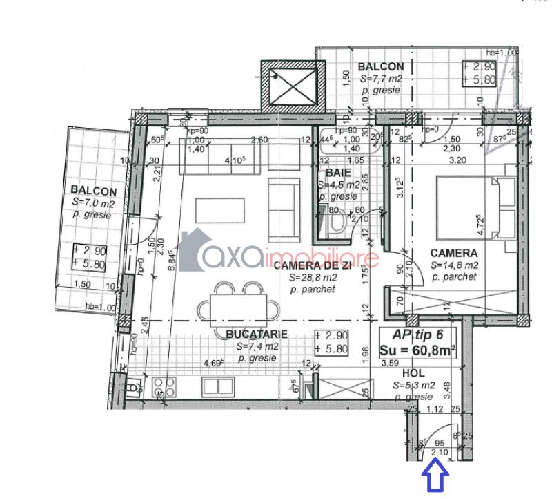 Suprafata utila este de 60.8 mp, fiind compartimentata intr-un living cu bucatarie open space, hol, 1 dormitor, 1 baie, 2 balcoane (7 mp si 7.7 mp).