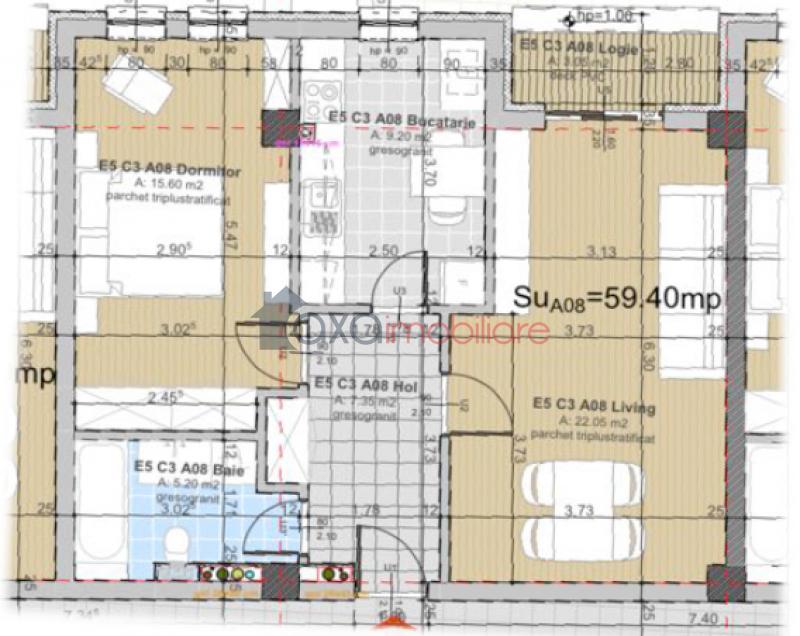 Apartamentul are o suprafata utila de 59.40 mp si este decomandat astfel: 1 living, 1 dormitor, 1 bucatarie, 1 baie, 1 hol si 1 logie.
