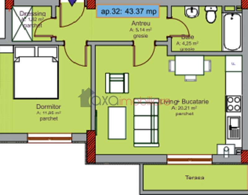 Compartimentarea este semidecomandata si gandita astfel: 1 living cu 1 bucatarie de tip open space, 1 dormitor, 1 baie, 1 dressing, 1 hol si 1 terasa.