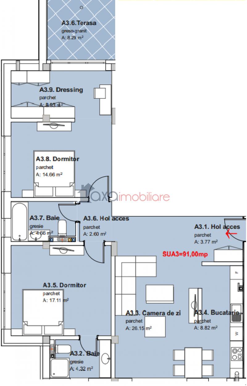 Este compus din: 1 living cu 1 bucatarie de tip open space, 2 dormitoare, 2 bai, 1 dressing, 1 terasa si 1 hol.