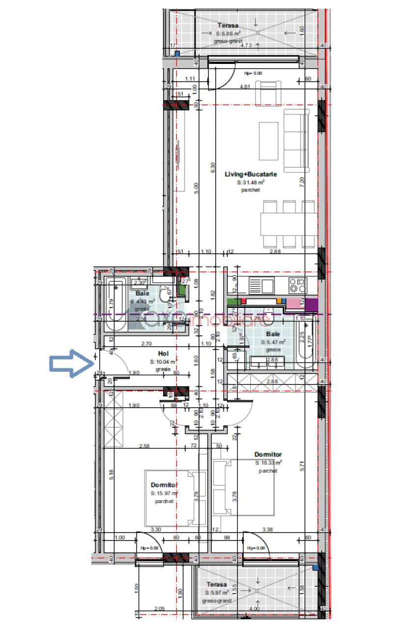 Compartimentare: 1 living cu 1 bucatarie, hol, 2 dormitoare, 2 bai + 2 terase (12.83 mp total).
