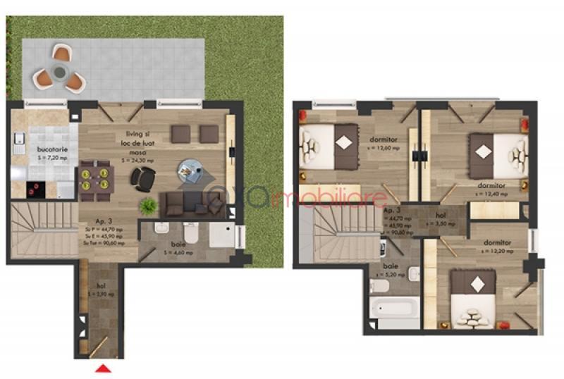 Apartamentul este pozitionat pe nivele astfel: PARTER: 1 living cu loc de luat masa, 1 bucatarie, 1 baie, 1 hol si 1 terasa. ETAJ 1: 3 dormitoare, 1 hol si 1 baie.