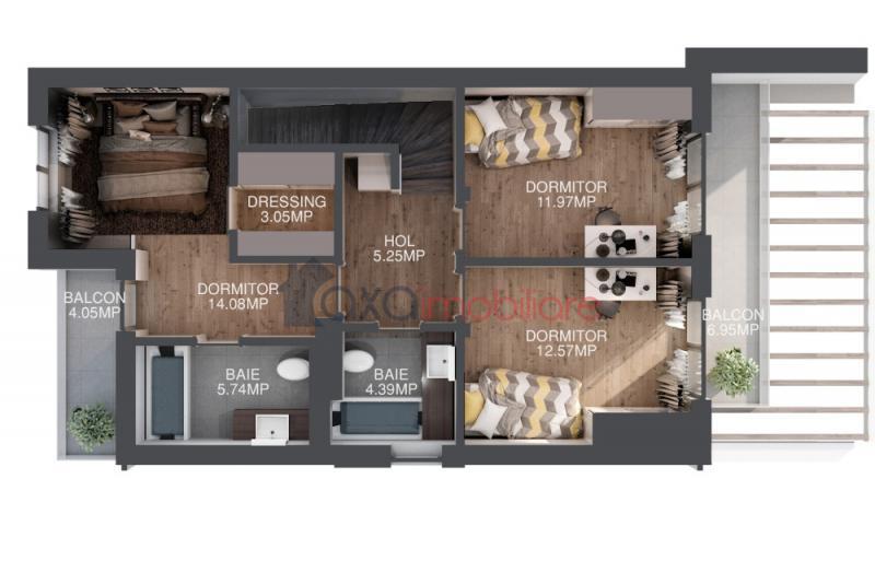 ETAJ / AL DOILEA NIVEL: hol, scara interioara, 1 dormitor matrimonial (cu baie proprie, dressing, balcon), 2 dormitoare, 1 baie comuna, 1 balcon.