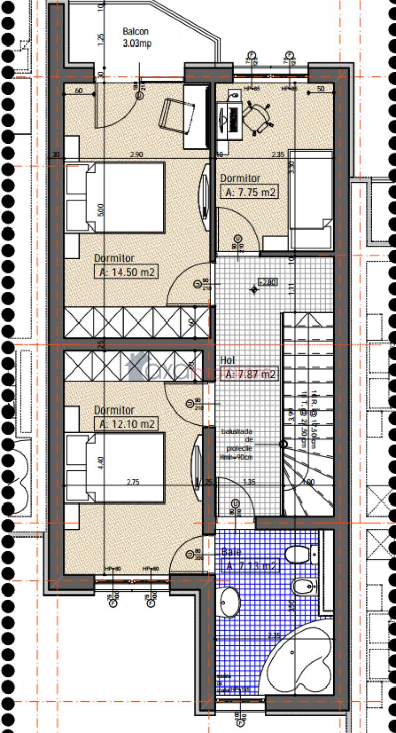 PARTER: 1 living cu 1 bucatarie de tip open space, 1 baie, 1 hol; ETAJ 1: 3 dormitoare, 1 balcon, 1 hol, 1 baie
